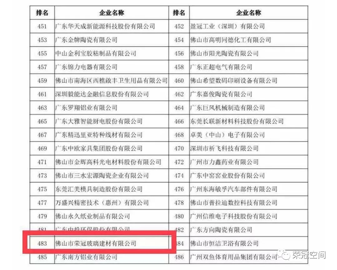 近日,2018廣東省制造業發展年會暨廣東制造業500強企業峰會舉行。大會由廣東省制造業協會、廣東省產業發展研究院、廣東省社科院企業競爭力研究中心共同主辦 , 發布了2018年廣東省制造業500強企業名單,佛山市榮冠玻璃建材有限公司榮登榜單。