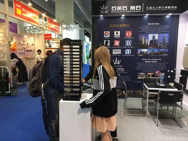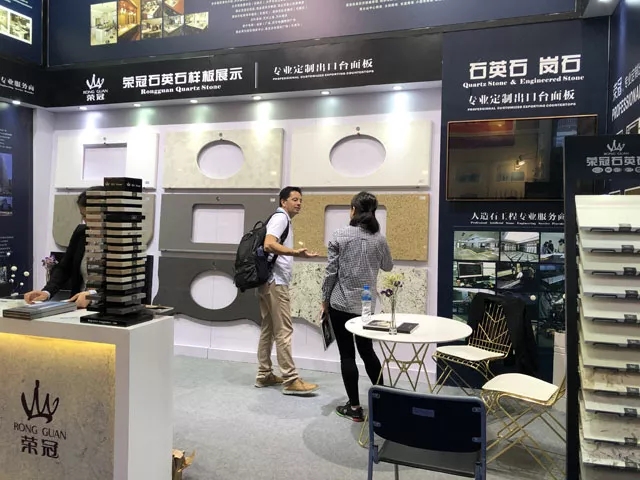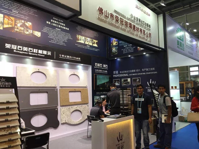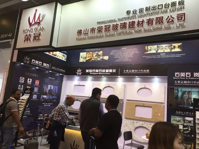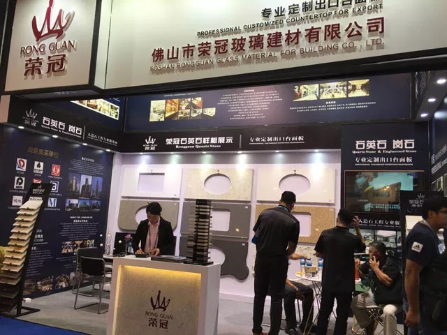 作為人造石工程專業服務商,榮冠石材擁有十多年積累的豐富生產加工經驗,并使用國外引進的先進生產設備,確保產品性能穩定,工藝品質卓越。在本屆廣交會中,榮冠石材展示出臺面板的設計加工各個流程,并通過臺面板異型切割開孔組合等精細工藝展示,體現出榮冠在精加工方面的雄厚實力,獲得了觀展客商的一致好評。