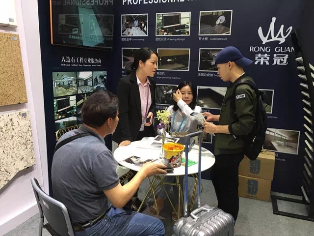 榮冠出口部工作人員向蒞臨展位的客戶講解了榮冠石英石臺面產品的品質優勢,與來自全球各地的客商深入洽談合作。