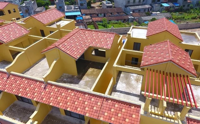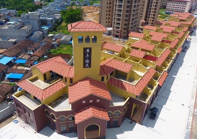 從天空俯瞰下來,整個厚土陽光項目最亮眼的,無疑是那黃色的立墻搭配鮮明醒目的榮冠西瓦所形成的混鋪屋面效果。