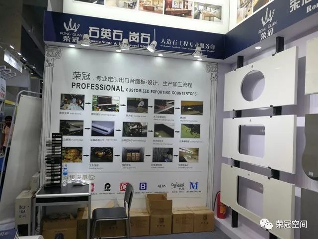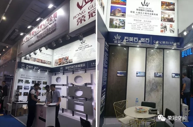 榮冠石材展位以白色作為主背景,搭配藍黑色邊框,在整個展區尤為顯眼。榮冠石材專業定制出口臺面板,以匠心為客戶提供優質的產品和服務。本次展位除了展示我司最新石材精品和臺面板加工工藝外,還重點突出了我司人造石應用在國內大型商業工程中的諸多案例,展現出榮冠石材的品牌優勢與技術實力。