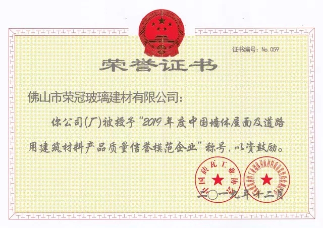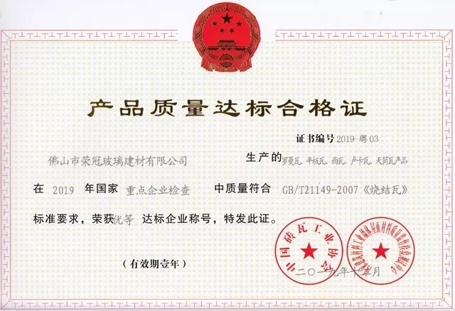 2019年12月13-15日,“2019年全國墻體屋面及道路用建筑材料產品質量分析總結會暨綠色高質量發展論壇”在安徽省淮北市隆重召開。榮冠建材在會上被授予“2019年度中國墻體屋面及道路用建筑材料產品質量信譽模范企業”榮譽稱號,公司生產的羅曼瓦、平板瓦、西瓦、盧卡瓦、天筒瓦產品在國家重點企業檢查中榮獲“ 優等達標企業 “ 稱號。