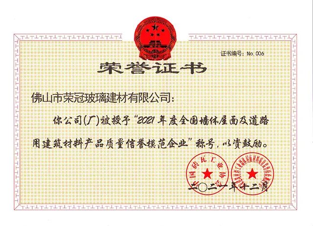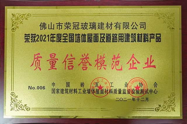 為促進(jìn)行業(yè)技術(shù)創(chuàng)新、節(jié)能減排、減污降碳及質(zhì)量提升,樹立標(biāo)桿效應(yīng)和品牌效應(yīng)。會上,對佛山市榮冠玻璃建材有限公司等82家企業(yè)授予了“2021年度全國墻體屋面及道路用建筑材料產(chǎn)品質(zhì)量信譽(yù)模范企業(yè)”稱號。這是榮冠公司連續(xù)4年獲得該項榮譽(yù)。