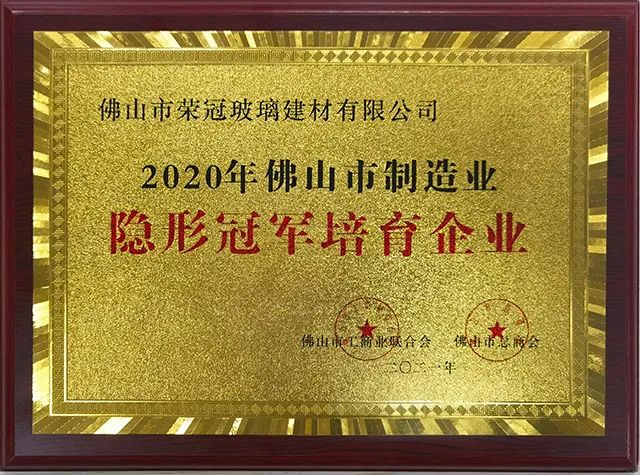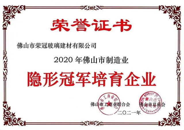 為進(jìn)一步提振企業(yè)發(fā)展信心,樹(shù)立標(biāo)桿,加快推動(dòng)佛山制造由大變強(qiáng)。日前,佛山舉行“專精特新”“隱形冠軍”企業(yè)座談會(huì),首次發(fā)布147家2020年佛山制造業(yè)“隱形冠軍”企業(yè)名單和326家“隱形冠軍”培育企業(yè)名單,并發(fā)布《2020年佛山市隱形冠軍企業(yè)發(fā)展報(bào)告》。佛山市榮冠玻璃建材有限公司憑借著優(yōu)秀的產(chǎn)品品質(zhì)和研發(fā)能力被評(píng)為2020年佛山市制造業(yè)隱形冠軍培育企業(yè)。