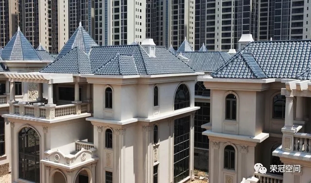 從天空俯瞰下來,藍紅雙色的榮冠西瓦鋪設減少了高密度建筑群體帶來的單一枯燥感,配合區域建筑色調的變化,使整體建筑保持整體歐式古典風格之余,還展現出了多彩的一面。鋪設后,保持建筑原有的奢華和尊貴,同時更為建筑群體添上莊重而大方的氣息,盡顯歐式宮廷風格建筑的雍容華貴。