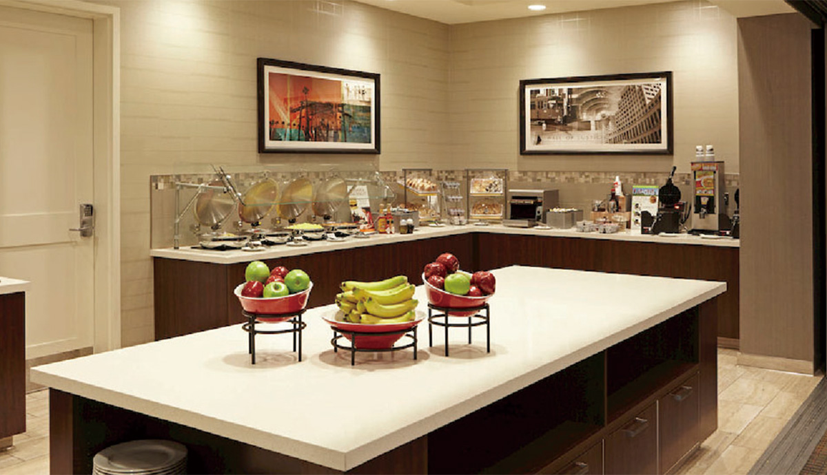 舒適度作為洛杉磯機場萬豪酒店的首要標準,一切設施都以此為目標。其中選用了榮冠石英石QS301用于臺面板。榮冠石英石表面如晶如點的花式細密清晰,玉石般晶瑩剔透,觸感溫潤細滑,造就了酒店的簇新面貌,不論是餐廳、洗衛室都增添一份時尚雅致的氣息,讓旅客瞬間忘記旅途的疲倦。
